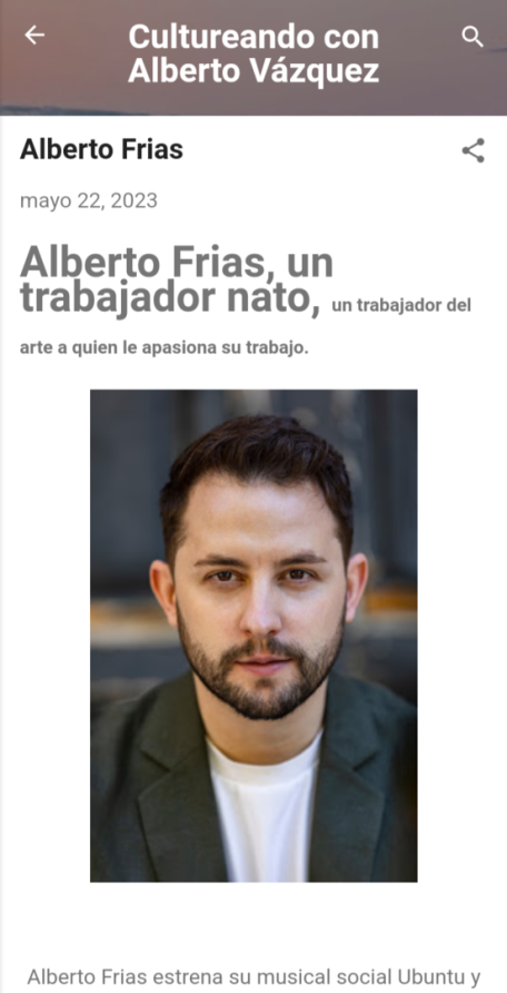 Alberto escribe en un blog personal todo sobre la cultura, su nombre: "Cultureando con Alberto Vázquez"